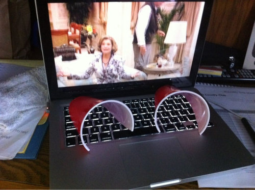 ノートPCの音量は、使い捨てカップを半分に切って置くだけで拡大できる。