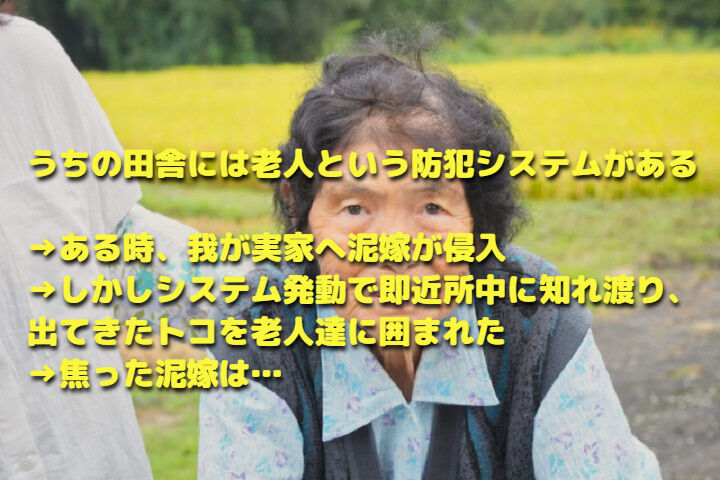 うちの田舎には老人という防犯システムがある→ある時、我が実家へ泥嫁が侵入→しかしシステム発動で即近所中に知れ渡り、出てきたトコを老人達に囲まれた→焦った泥嫁は… 2022年01月29日 カテゴリ:衝撃DQN ついに私も被害者になってしまった。愚痴らせて。ちょっと長くなりすぎたので推敲して来る。901: 名無しの心子知らず 2010/10/05(火) 17:10:29 ID:reVG3Yg6まっぱで正座してまってる。905: 名無しの心子知らず 2010/10/05(火) 17:18:32 ID:KB+3Aj5Zうちの実家は、老人ばかりでいまだに鍵をかけずに外出してしまうような地域にある。不用心に思えるが、ほとんどの家が日中に誰かしら老人がいて、見知らぬ人が来ると窓から覗いて凝視したり、何をしてるんだと声をかけたりするので、長い間泥棒被害やセールスマン被害がない、ある意味治安のいい場所。実家は私が自立してからそこに引っ越した新参なので、私は近所の人との付き合いが無い。先日、旦那ともめて実家に帰って来た。子供はいない。夜になったら、いきなり近所から騒音。母親が子供を怒鳴る、それも「てめぇやんなっつってんだろぉ!?おー!?」みたいな叱るというかDQNの恫喝レベルの声。子供がそれで泣き出すと、今度は父親の「るっせぇんだよぉー!るるるぁ!」という、やはりDQNがよくやる意味不明な威嚇音つきの怒声…その後で夫婦喧嘩が始まる。 ⇒続きを読む