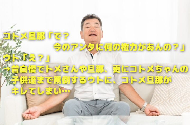 コトメ旦那「で?今のアンタに何の権力があんの?」ウト「え?」→昔自慢でトメさんや旦那、更にコトメちゃんの子供達まで罵倒するウトに、コトメ旦那がキレてしまい… 2022年01月30日 カテゴリ:酷い 短くまとめきれないので分けます。流れ切ってごめんなさい。スカッとはできたんだけど、疑問が残ったので質問を兼ねて報告を。トメさんは今の時代の育児にも積極的に協力してくれて、偏食持ちの旦那と子供たちの為に色々と工夫した料理の情報交換なんかをし合う良トメさん。が、ウトさんがどうしようもない人だった。もうとっくの昔に定年退職してるんだけど、とにかく自分の経歴が自慢で、周りをバカにしなきゃ気が済まない。ターゲットは私の他に自分の息子(旦那)や良コトメちゃん、果ては孫にまで「俺は大卒だ、俺の言うことは全て正しいから言うことを聞け」「高卒のお前(旦那)の子なんて高卒に決まってる」「俺が若い頃には会社の皆が俺を頼ったもんだ。俺がいないと何もできない」とグチグチうるさい……。私たち夫婦を標的にするならまだ対処できるけど、私らの見てないところで子供たちにまで自慢話をされる。なので子供たちも、あまりウトには近付かなかった。で、事が起こったのは今年の夏休み。 ⇒続きを読む