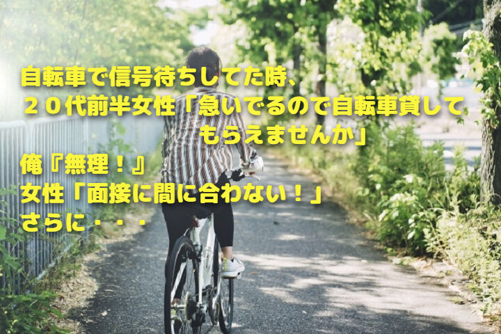 自転車で信号待ちしてた時、20代前半女性「急いでるので自転車貸してもらえませんか」俺『無理!』女性「面接に間に合わない!」さらに・・・ 2022年09月28日 カテゴリ:衝撃 自転車で信号待ちしてたら横から「すいません」と声掛けられた。視線向けたら20代前半くらいの女性で、少し焦ったように「急いでるので自転車貸してもらえませんか」だって。 ⇒続きを読む
