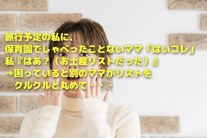 旅行予定の私に、保育園でしゃべったことないママ「はいコレ」私『はあ?(お土産リストだった)』→困っていると別のママがリストをクルクルと丸めて・・・ 2022年09月26日 カテゴリ:胸スカ 週末に旅行に行くんですが、出ましたよ。お土産リスト渡してくるママww保育園の入り口の辺で仲いいママさんたちと世間話(旅行の話は出てない)してたら、しゃべったこともないママが「はいコレ」ってメモ渡してきました。「はい?」って言ったら「はいじゃなくてコレ。お願いね」ですって。「いや、意味わかんないです」って言ったら「は?旅行行くならお土産買ってくるのが当然でしょ?」と鼻で笑われましたw ⇒続きを読む