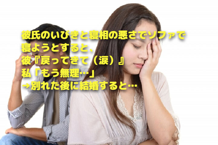 彼氏のいびきと寝相の悪さでソファで寝ようとすると、彼『戻ってきて(涙)』私「もう無理…」→別れた後に結婚すると… 2022年09月26日 カテゴリ:酷い うちのアパートで同棲してた彼氏。病的ないびきと寝相の悪さで、こちらが寝不足に。ベッドを分けてくれとか自分の家に帰れと言っても聞いてくれず、仕方なくこちらが隣室のソファで寝ようとしたらお願いだからベッドに戻ってきてと泣きそうになりながら言う。ベッドに戻るまでずーーーっとこれを繰り返す。その頃、貧血治療で避妊薬飲んでたんだけど、偏頭痛の原因かもという話で服用を中断。そのことを話したら、いきなり夜の回数が激減。週に何度も求めてきてたのに、3か月に1回そういうそぶりを見せるかどうかってくらいになり、結局半年近くレス。妊娠の可能性が少しでもあったらしてくれないんだと聞いたら、結婚前提だから大事にしたいと言う。じゃあ今までの欲はなんだよ。 ⇒続きを読む